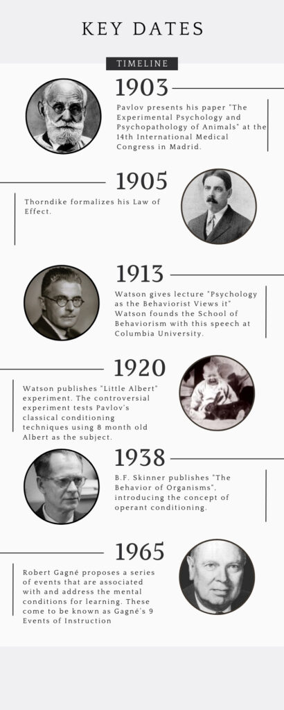 Behaviorism is a psychological school of thought which had its beginning in the early 20th century that focuses on observable behaviours rather than internal events like cognitive processing and emotion. Behaviorism asserts that all behaviour is acquired through conditioning. This conditioning can be further classified into either classical (Pavlov) or operant (Thorndike, Skinner).